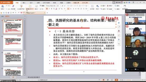 接下来,吕航同学报告了论文《企业分拆上市动因及绩效研究》,该文从新的角度研究了企业分拆上市的原因及影响;点评老师建议该同学多一点注重动因与影响之间的关联、紧扣文章的核心问题即分拆对企业的影响、并完善开题报告的模型和变量。张诗蓓同学的报告题目是《绿色信贷发展对环保企业投资的影响》,该文分析绿色信贷政策对企业投资水平的影响机制,与会的老师建议该同学写文章时注意体现中介效应的理论基础,在报告中体现类似变量选择、模型设计等实证研究的过程,参考文献选择跟进最新的研究;詹翔博同学报告的题目是《区域金融发展对企业R&D投入的影响》,该文研究了不同区域的金融发展情况对企业创新投入的影响,点评老师建议该同学注重研究理论基础的权威性、在研究设计时注意体现影响途径,注重每个变量的精确衡量和数据来源。老师们认真而精彩的点评让与会的所有同学受益匪浅。