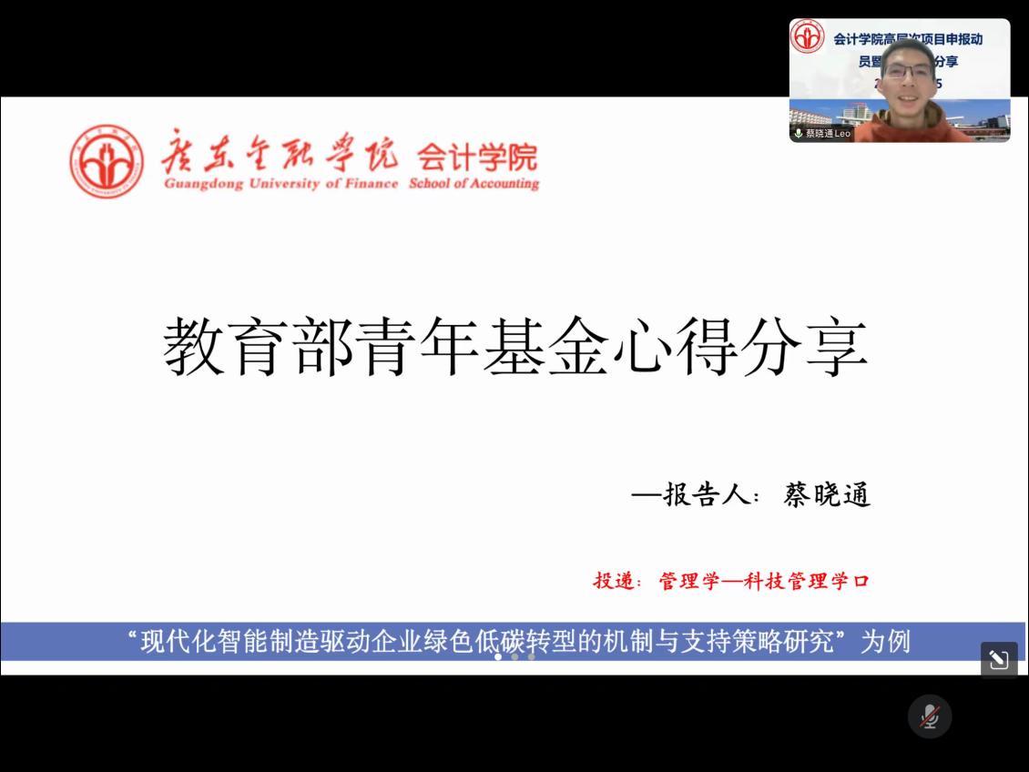 随后,2024年国家社科基金项目获得者陈泽艺博士、2024年教育部人文社会科学研究项目获得者姜艳凤博士和蔡晓通博士分别分享了课题申报的心得体会。陈泽艺博士谈到,在2024年的国家社科基金项目申报中,她通过多次与专家学者交流,不断改进自己的申报方案,最终选定了备受关注且与专业密切相关的“财会监督”主题。她建议,撰写申报书时,先确定研究框架,再逐步填充内容;在修改过程中,需参考专家意见,从选题背景到学术价值全面优化。此外,她还特别分享了压缩字数至7000字以内的技巧,以提升申报书的规范性和表达的精炼度。
