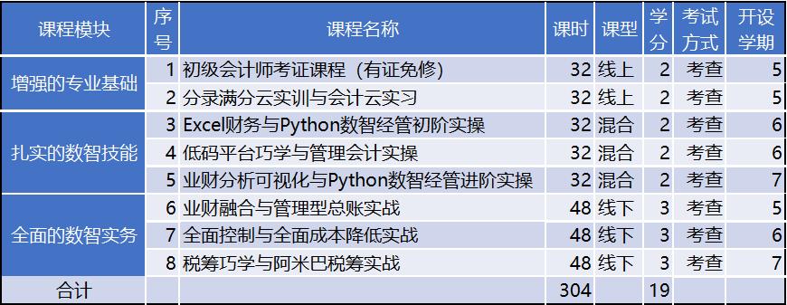 课程特色:在课程模块设计中,将“增强的专业基础”、“扎实的数智技能”与“全面的数智实务”有机结合,在学分设计中,特别注重员工智能会计与数智经管动手实操能力的培养。