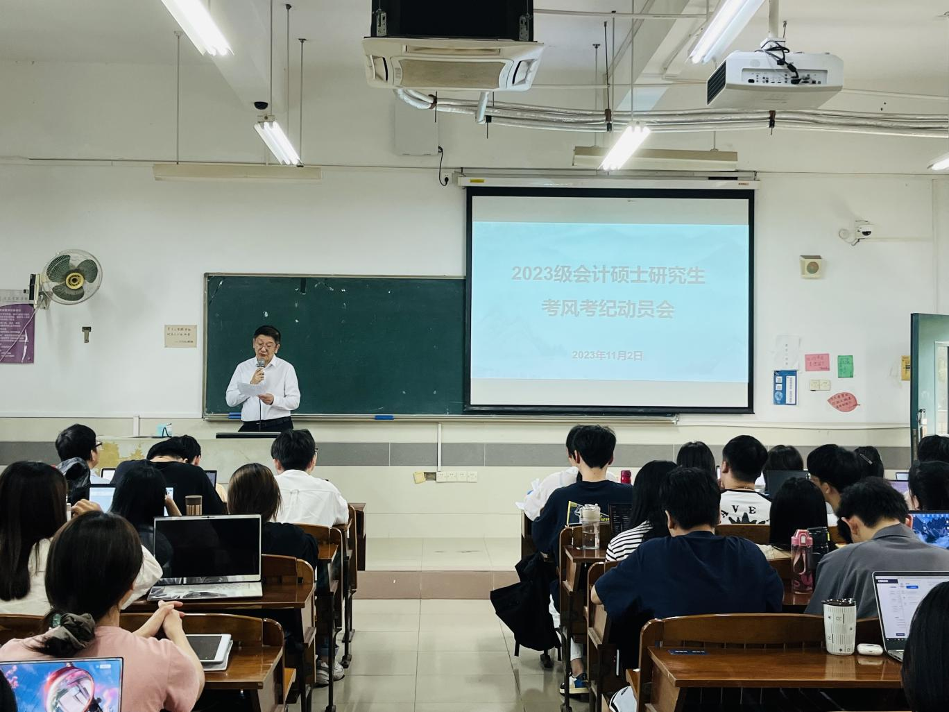 为加强学风建设,严肃考风考纪,365英国上市集团于2023年11月2日下午16:30在北教学楼 C-504召开了2023-2024学年第一学期会计硕士研究生考风考纪动员大会。本次会议由秦格副经理主持,舒利敏副经理、辅导员梁小健老师以及2023级全体会计硕士研究生参加了本次会议。